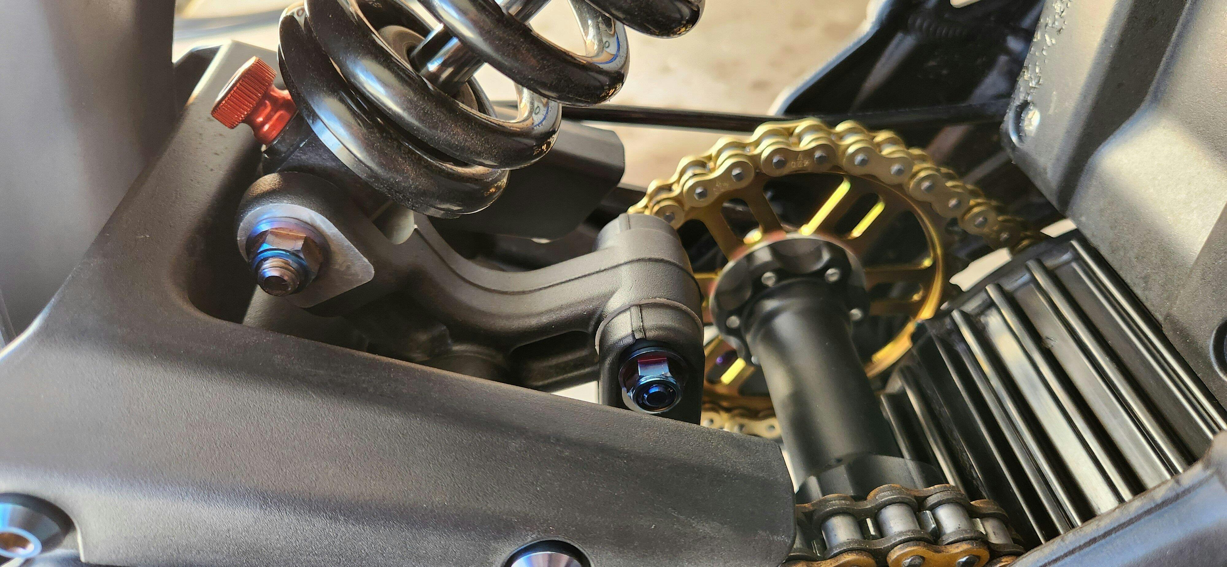 If using an aftermarket swingarm, linkage bolt to swingarm may require 1 to 2 M8 washers.